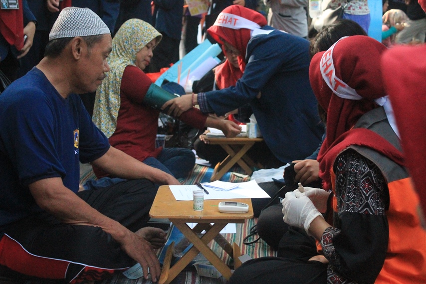 Tema yang diangkat mahasiswa keperawatan kali ini adalah “Indonesia Bebas Diabetes”. Para mahasiswa memberi cek kesehatan gratis pada masyarakat yang lokasinya di dekat area skateboard. Bekerja sama dengan Rumah Zakat, cek kesehatan tersebut meliputi cek tensi atau tekanan darah dan tes gula darah tanpa dipungut biaya. Mekanisme cek kesehatan mengggunakan kupon yang dibagikan oleh mahasiswa keperawatan kepada masyarakat. Respon masyarakat sangat tinggi dan antusias untuk mengikuti cek kesehatan ini. Kegiatan dilanjutkan dengan prosesi tanda-tangan petisi pada banner yang disediakan untuk “Melangkah Bersama Cegah Bebas Diabetes”.
