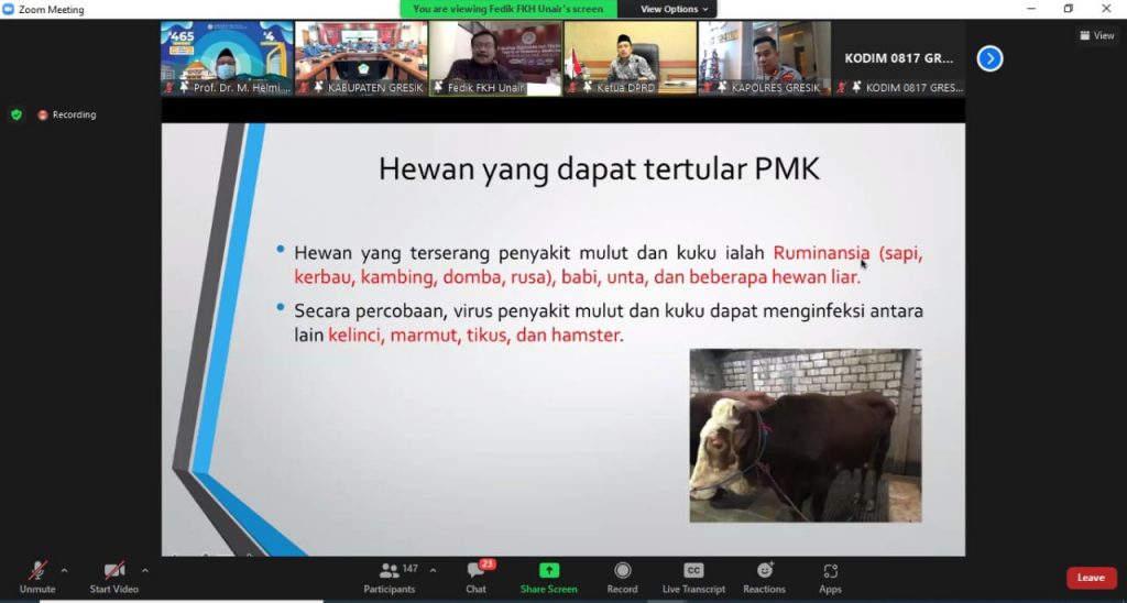 UNAIR NEWS – Upaya penanganan dan pengendalian Penyakit Mulut dan Kuku (PMK) terus dilakukan. Kali ini, sosialisasi diberikan Fakultas Kedokteran Hewan (FKH) Universitas Airlangga (UNAIR) bersama Pemerintah Kabupaten Gresik kepada peternak, Selasa (17/5/2022).