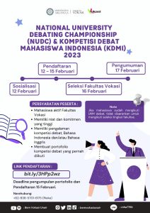 Hai Voks!! National University Debating Championship (NUDC) dan Kompetisi Debat Mahasiswa Indonesia (KDMI) merupakan kompetisi debat agenda dari Kemendikbudristek untuk mahasiswa seluruh mahasiswa. NUDC merupakan