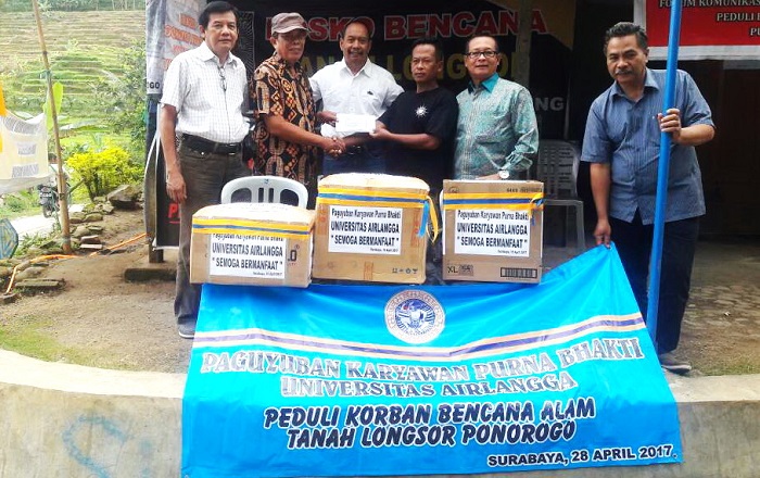 UNAIR NEWS – Kendatipun belum diresmikan, juga belum membentuk pengurus definitif, tetapi Paguyuban Karyawan Purna Bakti Universitas Airlangga (PKPB UNAIR) sudah membuktikan aksi sosialnya. Hari Jumat (28/4) pagi ini mereka mengirim bantuan untuk korban bencana tanah longsor di Desa Banaran, Kecamatan Pulung, Kabupaten Ponorogo.
