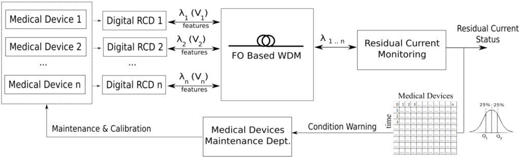 Gambar 3 menunjukkan sistem usulan yang memanfaatkan arus sisa dengan media komunikasi FO dalam memonitor kondisi alat kesehatan. Sinyal dikirimkan dari masing-masing alat kesehatan menggunakan RCD digital. Dengan memanfaatkan media FO dengan teknik WDM, pengiriman data dari masing-masing beban akan lebih efisien. Pelaksanaan perawatan ini tentunya juga bergantung pada jenis perawatan dan lamanya waktu yang dibutuhkan dengan mempertimbangkan besarnya perubahan yang terbaca pada RCD sebelumnya. Hal tersebut akan menjadi acuan jenis pekerjaan yang dibutuhkan. Matriks nilai tersebut kemudian juga akan di-update setelah dilakukan perbaikan atau kegiatan PM.