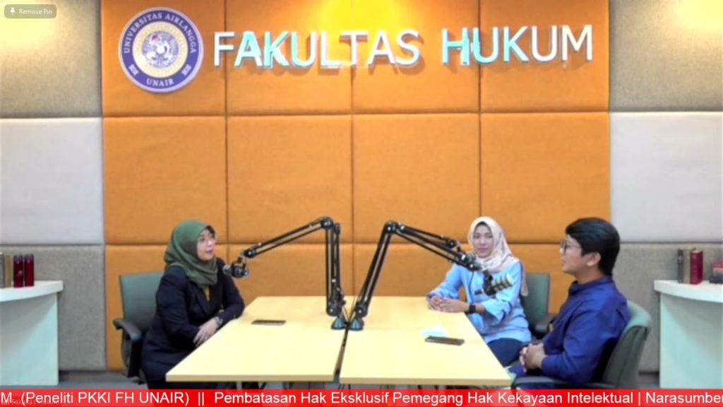 Pusat Kajian Kekayaan Intelektual (PKKI) Fakultas Hukum Universitas Airlangga (FH UNAIR) pada Rabu (6/7/2022) mengadakan podcast diskusi berjudul “Pembatasan Hak Eksklusif Pemegang Hak Kekayaan Intelektual”. Diskusi tersebut mengundang dua pembicara dari jajaran mahasiswa S3 FH UNAIR, Lidya Sherry Muis SH MKn MH dan Sigit Nugroho SH MH.