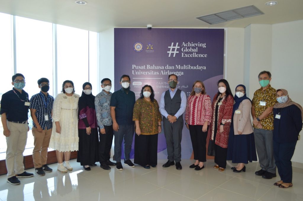 UNAIR NEWS – UNAIR menerima kunjungan rombongan RELO Director Dr. Bradley Horn dan tim RELO, Kedutaan Besar Amerika Serikat Jakarta, Education USA, dan Konsulat Jenderal Amerika Serikat Surabaya ke Academic Writing Center (AWC) UNAIR pada Kamis (18/11). Acara kunjungan tersebut dilangsungkan di ASEEC (Airlangga Sharia & Entrepreneurship Education Center Tower), Lantai 7.