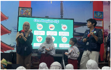 Mahasiswa BBK 7 kemudian memandu praktik menyikat gigi menggunakan alat peraga gigi dari