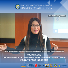 (FEB NEWS) “The Importance of Leadership and Culture in Organization”, demikianlah tema materi perkuliahan, untuk Mata Kuliah – Budaya dan Manajemen Perubahan, asuhan Dr. Tri Siwi Agustina, SE., MSi., yang disampaikan oleh pemateri Nina Agustriana – Head of Division Marketing Areas PT. Nutrifood Indonesia.