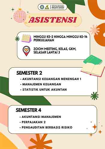 Agenda ini rutin diadakan pada hari senin sampai sabtu mulai tanggal 5 Februari 2024 sampai tanggal 3 juni 2024. Asistensi ini diadakan mulai pukul 15.30 WIB sampai pukul 20.00 WIB pada tempat yang disesuaikan dengan ketersediaan tempat seperti GKM, kelas, dan Selasar lantai 3 atau online melalui Zoom Meeting. Kegiatan yang dilakukan dalam asistensi ini meliputi penjelasan materi, sesi tanya-jawab, pengerjaan latihan soal, pembahasan soal, dan kuis. Adapun mata kuliah yang diajarkan pada Asistensi Genap 2024 ini adalah Akuntansi Keuangan Menengah 1, Manajemen Keuangan, Statistik untuk Akuntan, Pengauditan Berbasis Risiko 2, Perpajakan 2, dan Akuntansi Manajemen.