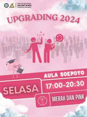 Upgrading merupakan agenda dari bidang human resources HMA Universitas Airlangga. Agenda ini memiliki tujuan sebagai sarana kegiatan bagi pengurus HMA periode 2024 untuk mengenal HMA lebih dalam sehingga dapat membangun chemistry antar pengurus. Dengan terkandungnya SDG’s poin ke-17 pada program kerja ini yaitu partnership for goals yang berarti adanya sebuah semangat kebersamaan untuk mencapai tujuan yang sama, Upgrading AKS1 2024 bertujuan untuk saling mengenal antar pengerus Himpunan Mahasiswa Akuntansi Universitas Airlangga,sehingga dapat membangun chemistery. Upgrading akan dilaksanakan selama pada tanggal 05 Maret 2024 yang bertempat di Aula Soepoyo yang berada di dalam Universitas Airlangga kampus B tepatnya di dalam gedung Fakultas Ekonomi dan Bisnis. Terdapat beberapa rangkaian acara didalamnya yaitu antara lain seminar yang akan diisi oleh pemateri dengan membawakan materi yang sesuai dengan soft skill berorganisasi yang nantinya juga akan ada sesi debat dari case yang diberi pemateri dan juga ada sesi games yang bertujuan untuk merilekskan pikiran dan juga masih ada acara lainnya yang sangat seru. Sasaran dari kegiatan ini diadakan untuk seluruh pengurus HMA Akuntansi periode 2024.