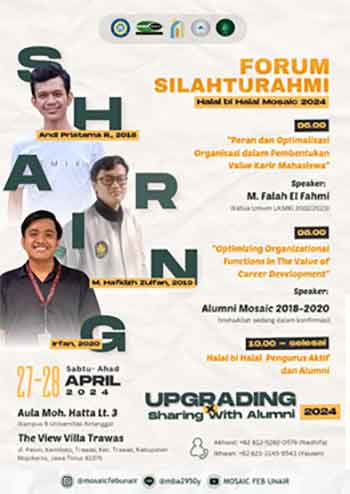 Sharing with Alumni MOSAIC ini merupakan kegiatan yang ditujukan kepada alumni MOSAIC Fakultas Ekonomi dan Bisnis Universitas Airlangga dan juga tentunya pengurus MOSAIC Fakultas Ekonomi dan Bisnis periode 2024. Sharing With Alumni, dikemas dengan kegiatan yang sangat menarik dan bermanfaat. Dalam bentuk forum diskusi dengan alumni MOSAIC FEB UNAIR berupa seminar serta diskusi santai untuk menjalin silaturahmi sekaligus menginspirasi baik pengurus maupun alumni MOSAIC dan kemudian dilanjutkan dengan halal bi halal.