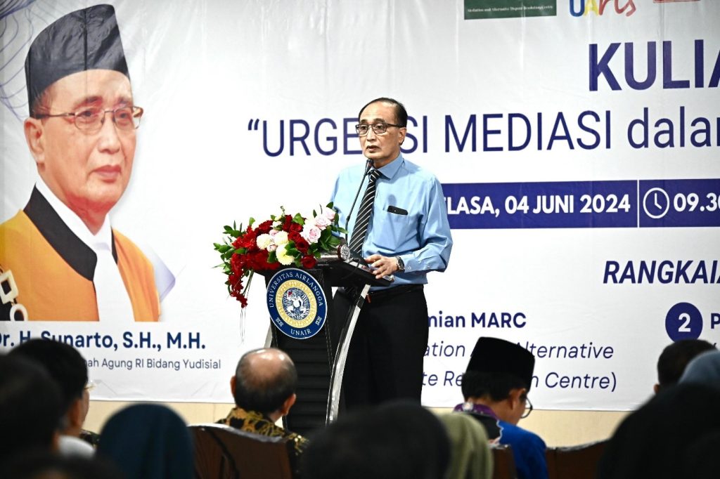 Humas (04/06/2024) | Pada Selasa (4/6/2024), Dr. Sunarto, S.H., M.H., Wakil Ketua Mahkamah Agung RI memberikan kuliah umum di Fakultas Hukum Universitas Airlangga (FH UNAIR). Dr. Sunarto yang merupakan alumni FH UNAIR menekankan tentang peran penting mediasi dalam penyelesaian perkara perdata di Indonesia. Kuliah ini dihadiri lebih dari 150 mahasiswa FH UNAIR baik dari program sarjana, magister hingga program doktoral. Selain itu juga, dihadiri oleh para certified mediator, dosen, hingga praktisi hukum.