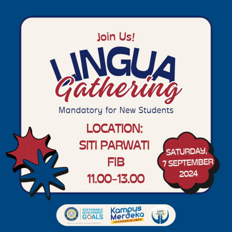 Setiap tahun, Program Studi Ilmu Linguistik Fakultas Ilmu Budaya Universitas Airlangga (FIB UNAIR) melalui Himpunan Mahasiswa (HIMA) Lingua mengadakan kegiatan Lingua Gathering. Begitupun tahun ini, HIMA Lingua 2024 menyelenggarakan kegiatan Lingua Gathering 2024 dengan mengusung tema “Mandatory for New Students”.