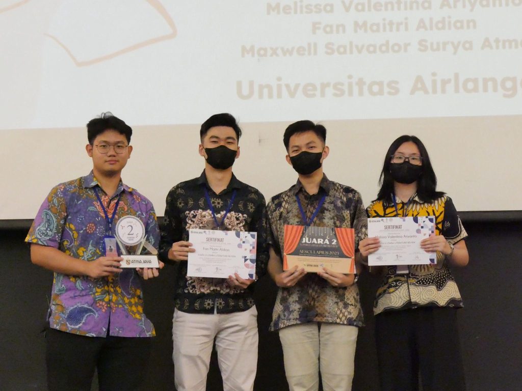 Membanggakan almamater tercinta adalah harapan bagi semua ksatria Airlangga, tak terkecuali bagi Fan Maitri Aldian, Maxwell Salvador Surya Atmaja, dan Melissa Valentina Ariyanto. Ketiganya berhasil meraih juara 2 lomba literature review pada acara Atma Cordis Aesculapius yang diadakan oleh Fakultas Kedokteran dan Ilmu Kesehatan Universitas Katolik Indonesia Atma Jaya (UAJ) Jakarta.