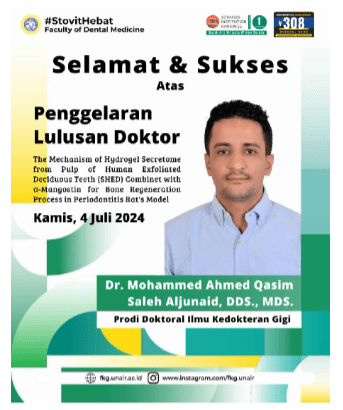 Surabaya, 23 Juli 2024 – Fakultas Kedokteran Gigi Universitas Airlangga (FKG UNAIR) dengan bangga mengumumkan keberhasilan Dr. Mohammed Ahmed Qasim Saleh Aljunaid, DDS., M.Kes. dalam menyelesaikan program doktoral Ilmu Kedokteran Gigi. Dalam disertasinya yang berjudul “The Mechanism of Hydrogel Secretome from Pulp of Human Exfoliated Deciduous Teeth (SHED) Combinet with α-Mangostin for Bone Regeneration Process in Periodontitis Rat’s Model”.