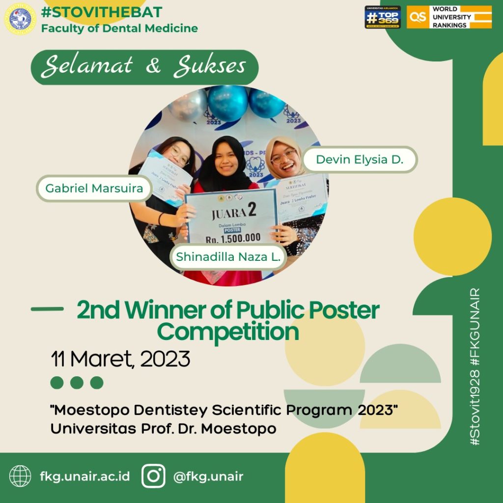 Selamat dan Sukses kepada Mahasiswi Shinadilla Naza Leginis, Devin Elysia Dhywinanda dan Gabriel Marsuira Fakultas Kedokteran Gigi Universitas Airlangga yang memperoleh prestasi 2nd Winner of Public Poster Competition dalam ‘Moestopo Dentistey Scientific Program 2023’ yang diselenggarakan oleh Universitas Prof. Dr. Moestopo.