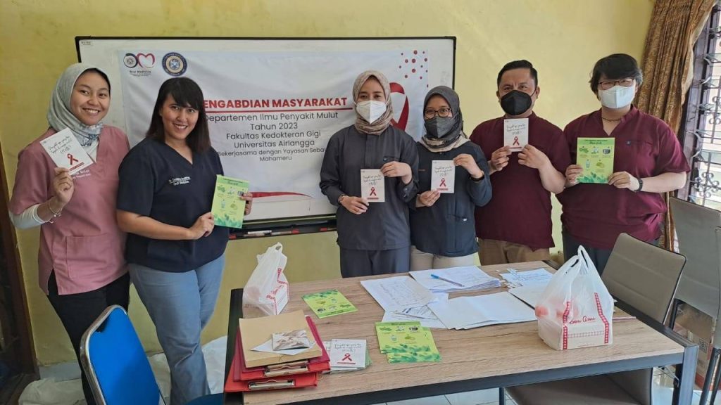 Kegiatan yang dipimpin oleh Dr. Desiana Radithia, drg., Sp.PM (K), sebagai ketua pelaksana kegiatan dan melibatkan mahasiswa PPDGS yakni Togu Andrie, drg., Karlina, drg., Selviana, drg., Aulya, drg., dan Gremita, drg, yang dilaksanakan pada tanggal 25 Juli ini, dilaksanakan untuk memberikan penyuluhan tentang gambaran klinis, pencegahan serta penanganan rongga mulut bagi Orang dengan HIV (ODHIV) di bawah naungan Yayasan Mahameru, Surabaya.