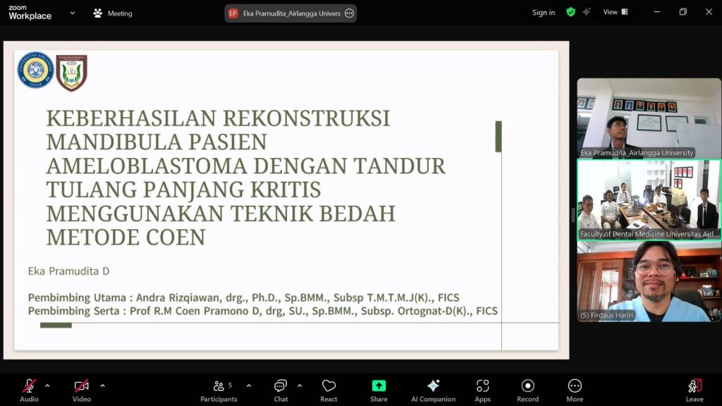 Surabaya, 31 Januari 2025 – drg. Eka Pramudita Djimantoro, mahasiswa Program Pendidikan Dokter Gigi Spesialis (PPDGS) Departemen Bedah Mulut dan Maksilofasial (BMM) Fakultas Kedokteran Gigi Universitas Airlangga (FKG UNAIR), berhasil menyelesaikan ujian proposal dengan sukses pada hari ini, Jumat, 31 Januari 2025.