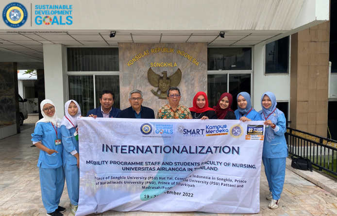NERS NEWS – Staff dan Mahasiswa Fakultas Keperawatan Universitas Airlangga sedang melaksanakan kegiatan “mobility Programme” di Konsulat RI Songkla pada hari Senin, tanggal 19 desember 2022 pukul 13.00-16.00 yang diikuti 3 dosen dan 5 mahasiswa. Kegiatan di Konsulat RI Songkla Thailand, melakukan pembicaraan terkait upaya-upaya peningkatan kerja sama pendidikan, penelitian, dan pengabdian kepada masyarakat secara U to U termasuk juga kerja sama penguatan kapasitas lembaga pendidikan antara Indonesia dalam hal ini Fakultas Keperawatan Universitas Airlangga dengan ke 3 (tiga) Universitas di Thailand seperti Prince of Songkla University (PSU), Prince of Naradiwads University (PNU), dan Pattani Univeristy (PU). Di Konsulat RI Songkla Thailand juga untuk capaian branding faculty. Di Madrasah/Pondok Attarkiyah Thailand merupakan suatu upaya meningkatkan student dari luar negeri, yaitu alumni pondok agar kuliah di Fakultas Keperawatan Universitas Airlangga, sehingga internasionalisasi tercapai.