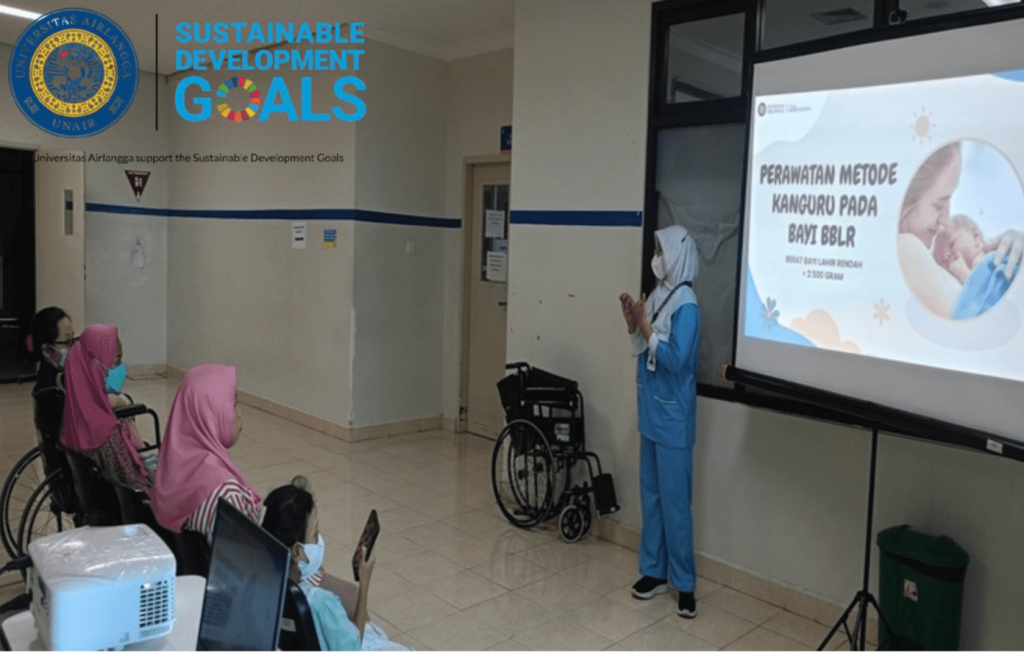 NERS NEWS – Mahasiswa Program Pendidikan Profesi Ners Fakultas Keperawatan Universitas Airlangga dari Kelompok 4 Stase Keperawatan Anak Angkatan 2021, sukses menggelar penyuluhan kesehatan tentang Perawatan Metode Kangguru pada bayi BBLR di Ruang tunggu Perina RS Universitas Airlangga pada Rabu (28/05/2025). Penyuluhan ini bertujuan untuk meningkatkan pemahaman masyarakat, khususnya keluarga pasien mengenai definisi, komponen, syarat, manfaat pelaksanaan perawatan metode kangguru.