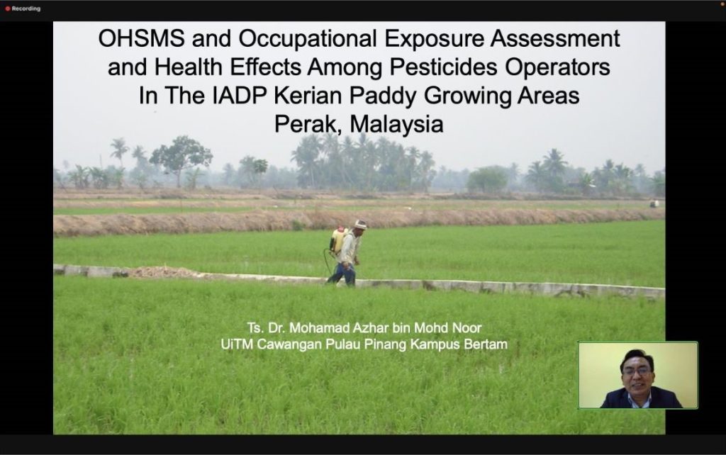 Perak, Malaysia”. Dr Azhar memberikan gambaran terkait pengelolaan K3 yang dikerucutkan dalam pengelolaan risiko dan pengelolaan individu. Dr Azhar juga menjelaskan bahwa paparan pestisida di tempat kerja dalam industri pertanian dapat terjadi melalui konsumsi, inhalasi, atau kontak dengan kulit. Pestisida itu sendiri mempengaruhi kesehatan manusia dalam tiga cara utama, yaitu efek akut, efek kronis, dan efek pada kondisi yang sudah ada. Sehingga, pekerja pertanian dapat terpapar residu pestisida selama kegiatan pencampuran dan aplikasi.
