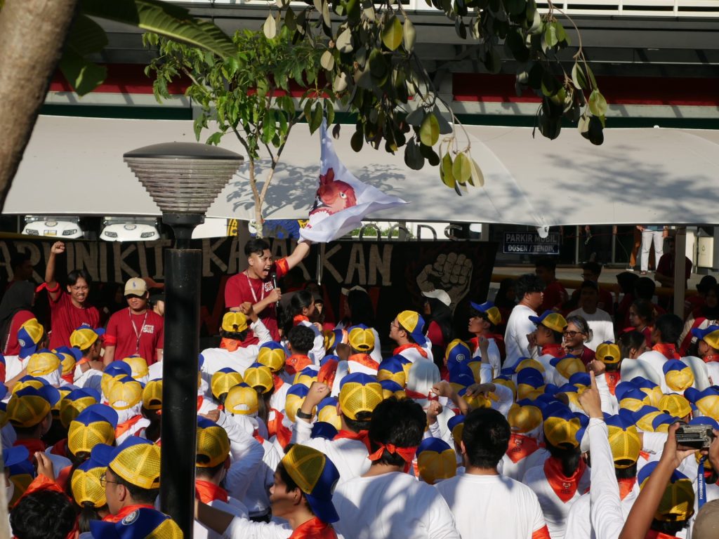 SURABAYA – ADM WEB | Memasuki hari terakhir United FISIP Orientation (UFO) pada Jum’at (25/8/2023), lebih dari 800 mahasiswa baru FISIP UNAIR melakukan simulasi aksi dengan mengelilingi kampus B UNAIR untuk menolak rancangan revisi Undang-Undang Nomor 6 Tahun 2014 tentang Desa. Orasi, nyanyian, dan spanduk yang bertuliskan ‘FISIP Menggugat’, ‘Sejahterakan Kepala Desa Sesatkan Warga Desa’, ‘Suara Desa Disabotase Penguasa’ dan lainnya merupakan simbol keresahan para mahasiswa baru yang menganggap revisi undang-undang tersebut akan menjadi celah berlangsungnya praktik korupsi.