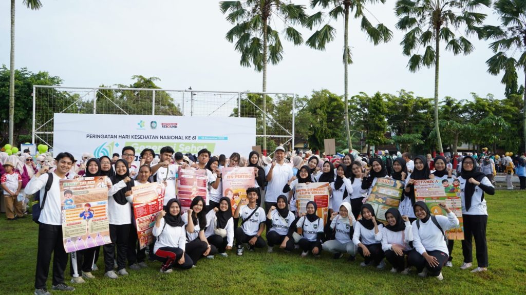 KABAR FIKKIA – Peringatan Hari Kesehatan Nasional (HKN) Ke-61 Kabupaten Banyuwangi terlaksana pada Minggu (23/11/2025) dengan senam dan parade jalan bersama tenaga kesehatan dari seluruh wilayah Bumi Blambangan. Kegiatan tersebut turut dihadiri oleh kepala dinas kesehatan, kepala puskesmas, kepala rumah sakit, bupati Banyuwangi dan Puteri Indonesia 2025. Sebagai bagian dari pendidikan kesehatan dan kedokteran, Fakultas Ilmu Kesehatan, Kedokteran, dan Ilmu Alam (FIKKIA) Universitas Airlangga (UNAIR) Banyuwangi turut serta memeriahkan kegiatan yang bertempat di Ruang Terbuka Hijau (RTH) Karetan, Kecamatan Purwoharjo.