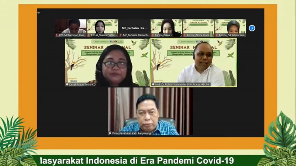 Kajian tersebut menjadi pembuka Seminar Nasional yang bertajuk “Urgensi Vaksinasi dalam Upaya Pemulihan Kehidupan Masyarakat Indonesia di Era Pandemi COVID-19”. Untuk sesi pertama, yakni Talkshow, mengundang dua orang pembicara. Pembicara pertama yakni Prof. Dr. Ridwan Amiruddin, S.KM., M.Kes., M.Sc.PH yang menjabat sebagai Ketua Perhimpunan Sarjana Kesehatan Masyarakat Indonesia (PERSAKMI). Untuk pembicara kedua panitia mengundang Bupati Banyuwangi Hj. Ipuk Fiestiandani Azwar Anas, S.Pd. yang diwakilkan oleh Dr. H. Widji Lestariono, M.MKes (Kepala Dinas Kesehatan Kabupaten Banyuwangi sekaligus Ketua Bidang Penanganan Kesehatan SATGAS COVID -19 Kabupaten Banyuwangi).