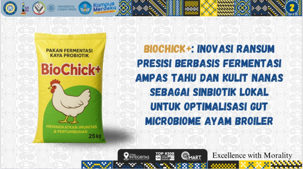 Tim UNAIR terdiri dari Beryl Christoper Fernando Utomo (Farmasi, 2024), Gadis Jacinda Elysia Tabina (Farmasi, 2024), dan Kharisma Putri Utami (Kedokteran Hewan, 2024). Mereka sukses menarik perhatian dewan juri lewat gagasan inovatif bertajuk BIOCHICK+: Inovasi Ransum Presisi Berbasis Fermentasi Ampas Tahu dan Kulit Nanas sebagai Sinbiotik Lokal untuk Optimalisasi Gut Microbiome Ayam Broiler.