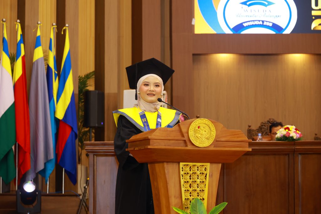 UNAIR NEWS – Wisuda 255 Universitas Airlangga (UNAIR) menyimpan berbagai momen membahagiakan. Salah satunya adalah momen sambutan perwakilan mahasiswa oleh Sri Puspita Anggraini. Wisudawan dari Fakultas Ekonomi dan Bisnis (FEB) itu dengan bangga berkesempatan untuk membagikan kisah dan menyampaikan sambutannya.
