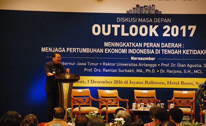 UNAIR NEWS – Salah satu cara untuk segera keluar dari middle income trap adalah dengan meningkatkan kualitas sumber daya manusia. Itulah yang disampaikan oleh Gubernur Jawa Timur Soekarwo ketika diwawancarai wartawan usai mengisi acara “Outlook 2017: Meningkatkan Peran Daerah: Menjaga Pertumbuhan Ekonomi Indonesia di tengah Ketidakpastian Global”, Kamis (1/12), di Hotel Bumi, Surabaya.