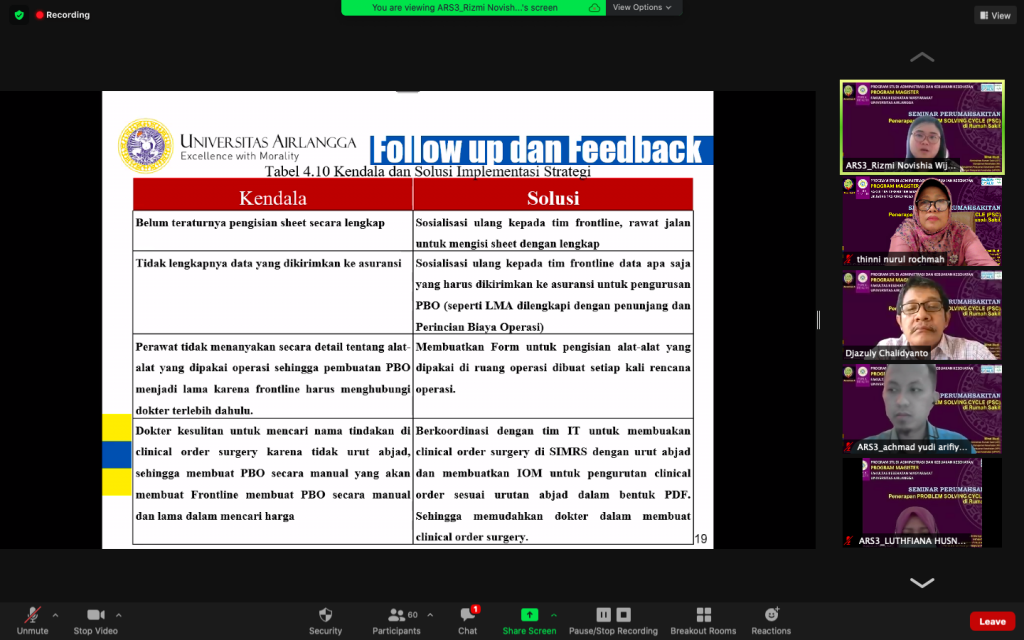 Program magister, Program Studi Administrasi dan Kebijakan Kesehatan (Prodi AKK) Fakultas Kesehatan Masyarakat Universitas Airlangga mengadakan Seminar Perumahsakitan dengan judul “Penerapan Problem Solving Cycle Di Rumah Sakit” secara online. Seminar yang dihadiri oleh manajemen rumah sakit, pakar perumahsakitan, dosen, serta mahasiswa Prodi AKK khususnya peminatan Administrasi Rumah Sakit. Seminar ini merupakan puncak dari rangkaian kegiatan residensi yang dilakukan oleh Prodi AKK peminatan Administrasi Rumah Sakit.