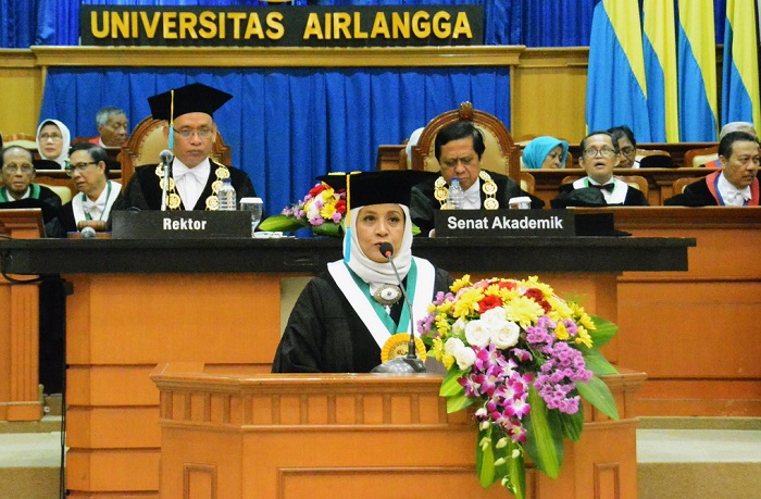 Prof. Dr. Mirni Lamid, drh., MP, memberikan orasi ilmiah dalam pengukuhan Guru Besar, hari Sabtu (10/12), di Aula Garuda Mukti, Rektorat UNAIR.