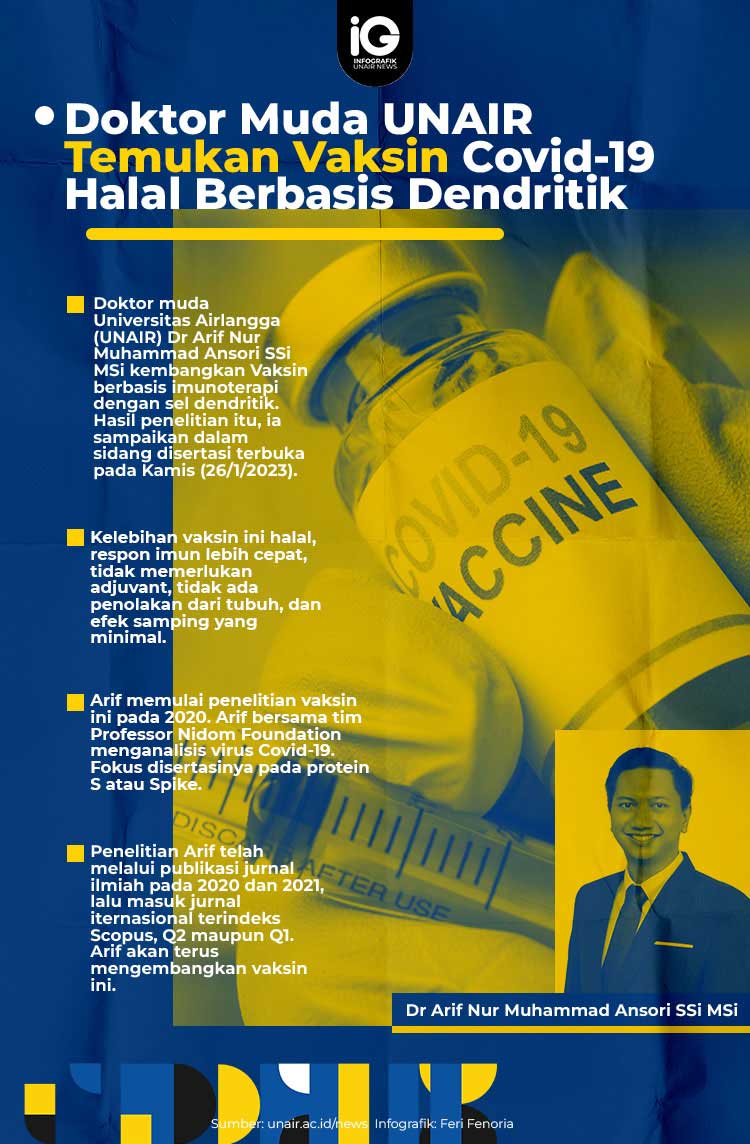 UNAIR NEWS – Doktor muda Universitas Airlangga (UNAIR) Dr Arif Nur Muhammad Ansori SSi MSi kembangkan Vaksin berbasis imunoterapi dengan sel dendritik. Hasil penelitian itu,