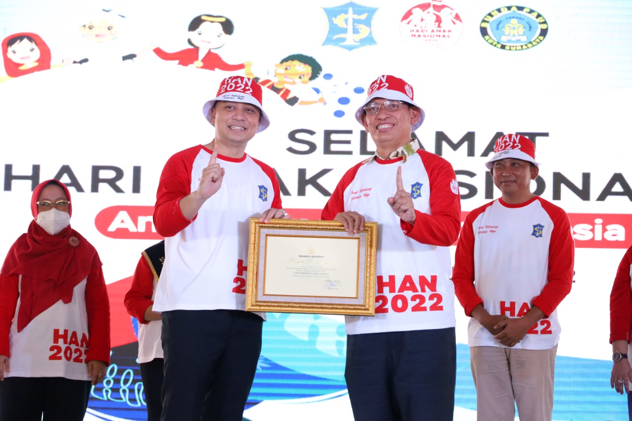 UNAIR NEWS – Prestasi membanggakan kembali diraih oleh Universitas Airlangga. Kali ini, dalam rangka memperingati Hari Anak Nasional Tahun 2022, Pemerintah Kota Surabaya memberikan piagam