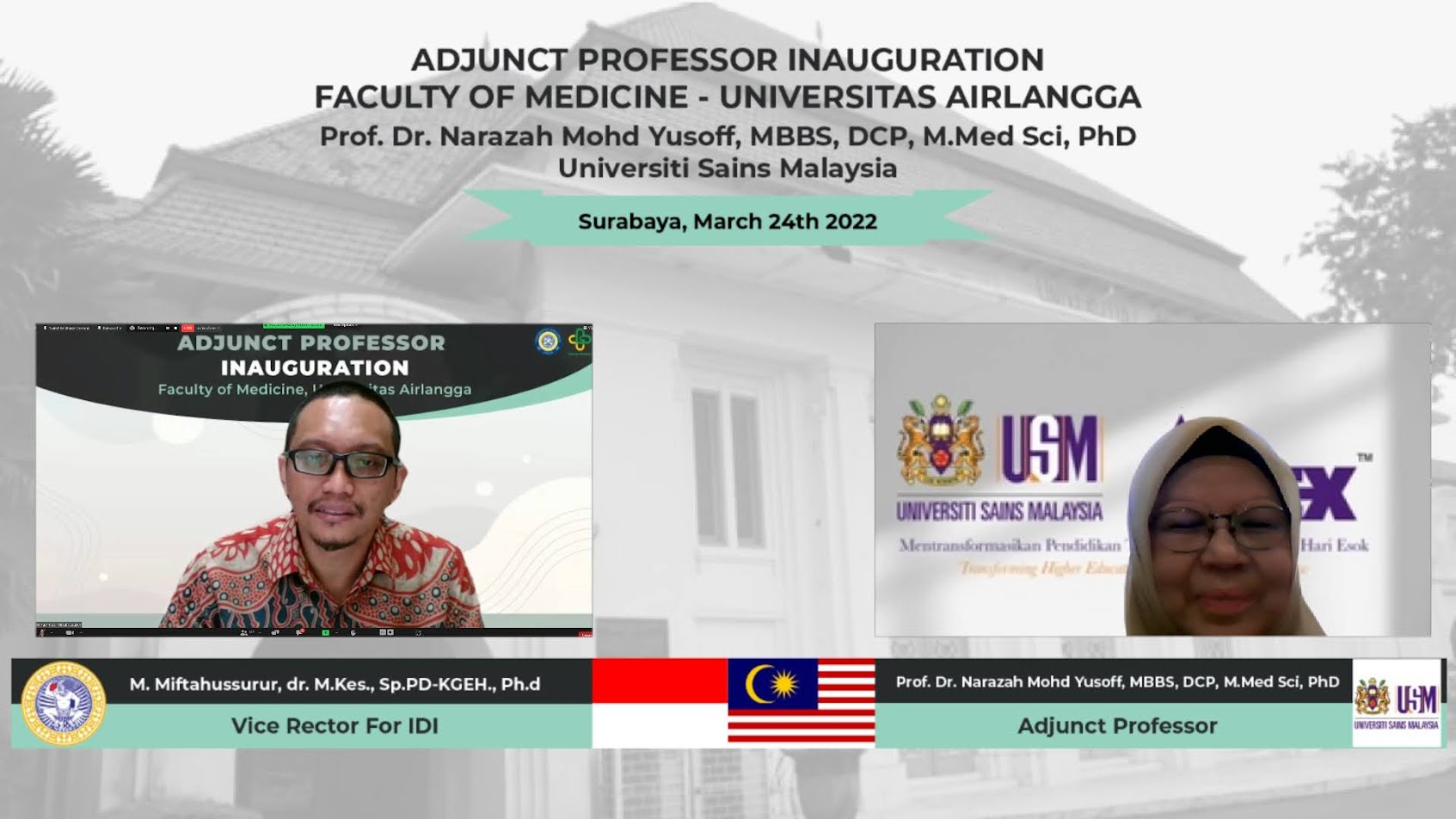 UNAIR NEWS – Fakultas Kedokteran Universitas Airlangga menggandeng guru besar dari Universiti Sains Malaysia (USM), Prof Dr Narazah Mohd Yusoff MBBS DCP M Med Sci