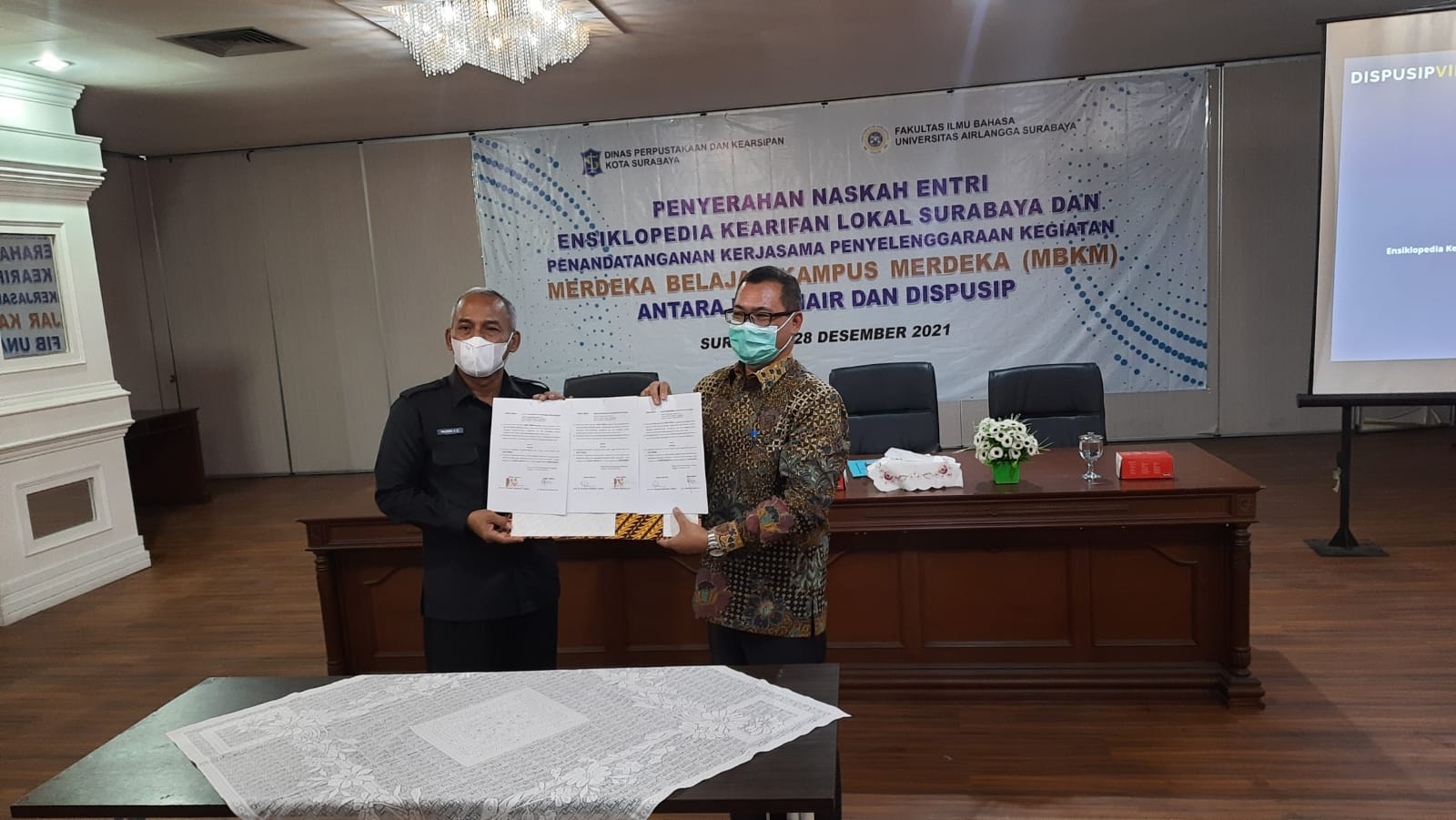 UNAIR NEWS – Fakultas Ilmu Budaya (FIB) baru saja menyerahkan 10 artikel entri ensiklopedia kearifan lokal Surabaya kepada Dinas Perpustakaan dan Kearsipan (Dispusip) Kota Surabaya