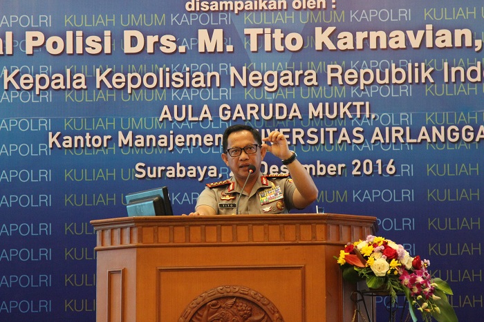 Kepolisian Republik Indonesia (Polri) menggelar kuliah umum di Aula Garuda Mukti Kantor Manajemen Universitas Airlangga, Kamis (29/12).