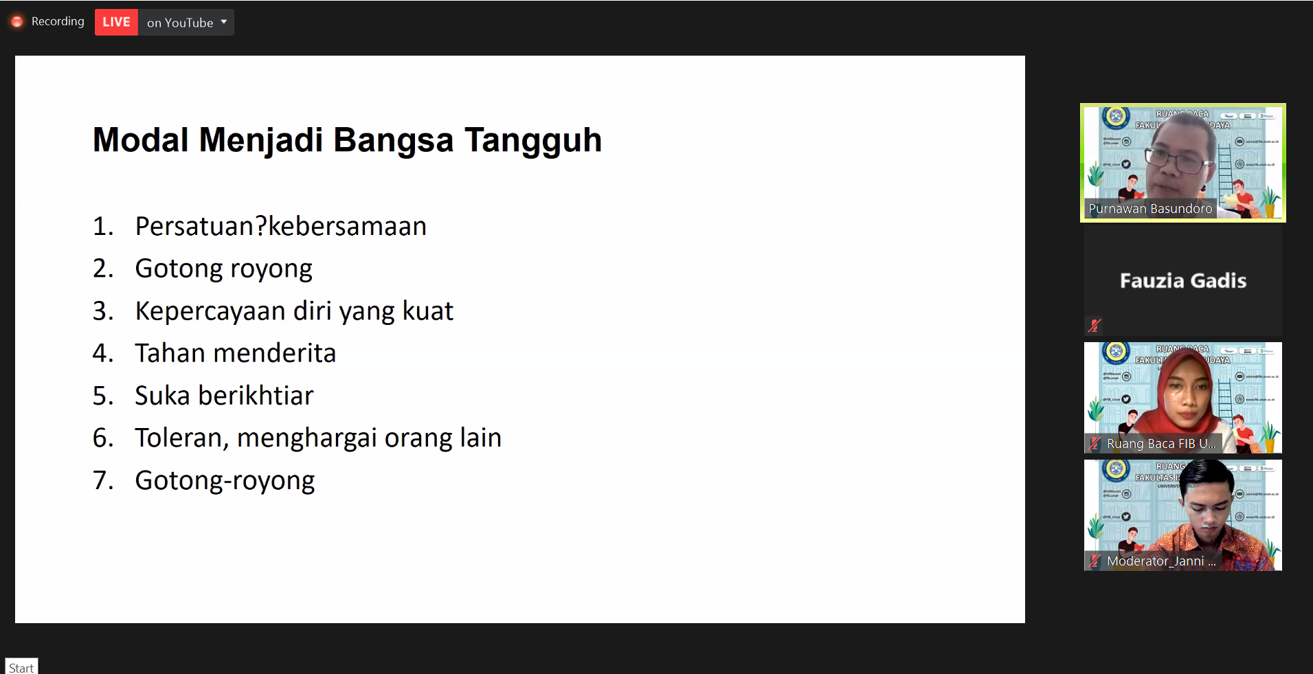 UNAIR NEWS – Ruang Baca Fakultas Ilmu Budaya Universitas Airlangga (RBC FIB UNAIR), gelar webinar bertajuk Bincang Merdeka: Indonesia Tangguh, Indonesia Tumbuh. Melalui platform Zoom