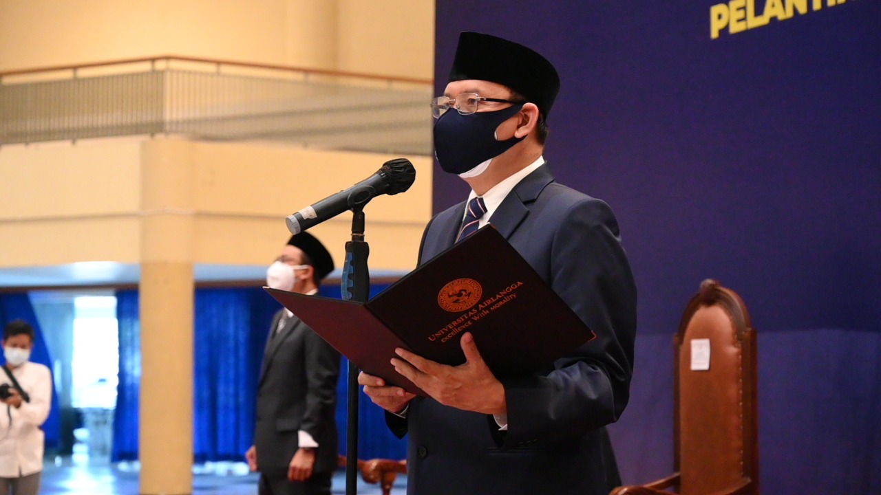 UNAIR NEWS – Iringan lagu kebangsaan Indonesia Raya mengawali upacara pelantikan wakil dekan dan wakil direktur di lingkungan Universitas Airlangga pada Jum’at (16/10/2020) di Airlangga