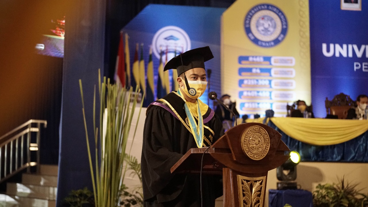 UNAIR NEWS – Perwakilan wisudawan, Noviana, S.H., M.H., menyampaikan sambutannya pada wisuda hari ketiga periode Desember 2021, Senin (6/12/2021). Dalam sambutannya ia menekankan pentingnya kontribusi