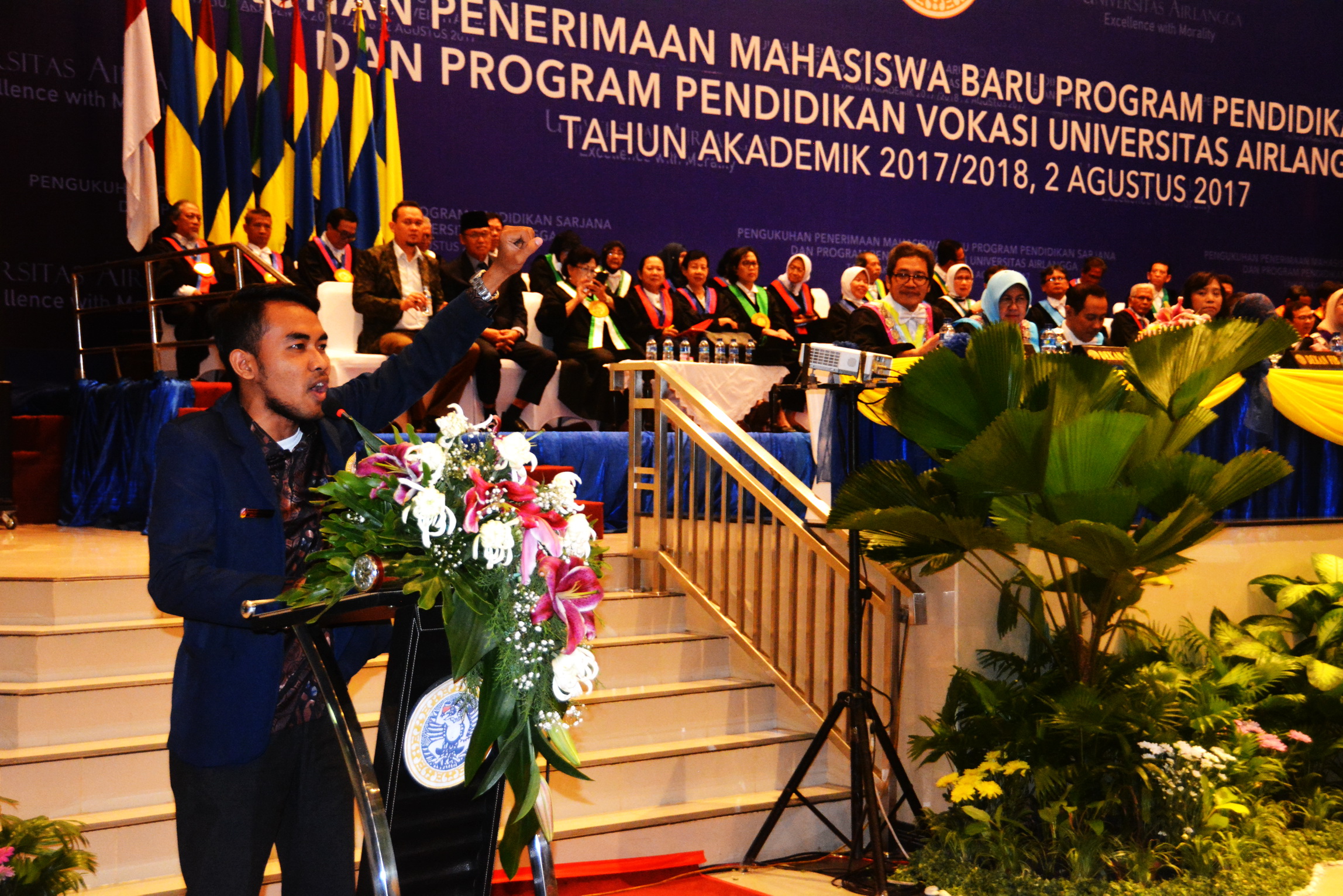 Rektor Universitas Airlangga Prof. Moh Nasih didampingi para Dekan mewisuda 840 lulusan UNAIR, hari Sabtu (9/9). Mereka berasal dari lulusan jenjang Vokasi (D-3) hingga Doktor (S-3). Ini merupakan wisuda hari pertama, edisi September 2017. Hari Minggu (10/9) dilanjutkan lagi dengan melantik 845 lulusan UNAIR.