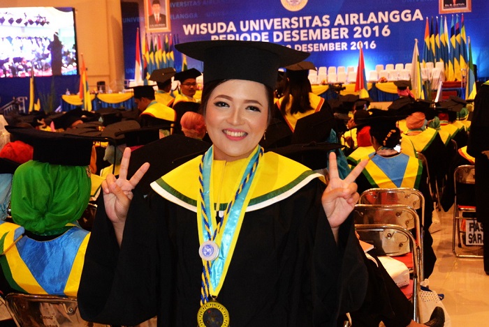 Ayu Lawuningtyas Hariadini, M.Farm menjadi wisudawan terbaik jenjang S-2 Fakultas Farmasi Universitas Airlangga dengan IPK 3.95.