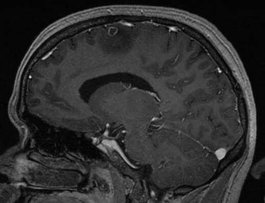 Pada pemeriksaan magnetic resonance imaging (MRI) kepala, didapatkan tumor berukuran 4×2,3×2,1 cm yang mengelilingi ventricular drain. Massa tampak isointense pada T1 dan hypointense pada T2. Massa tampak menyangat kontras secara heterogen. Pada dynamic susceptibility contrast (DSC) MRI perfusion dan MR Spectroscopy (MRS) mendukung ke arah proses keganasan. Tidak didapatkan gambaran meningoensefalitis. Dari hasil pemeriksaan MRI kepala mendukung ke arah proses metastase dari kraniofaringioma.