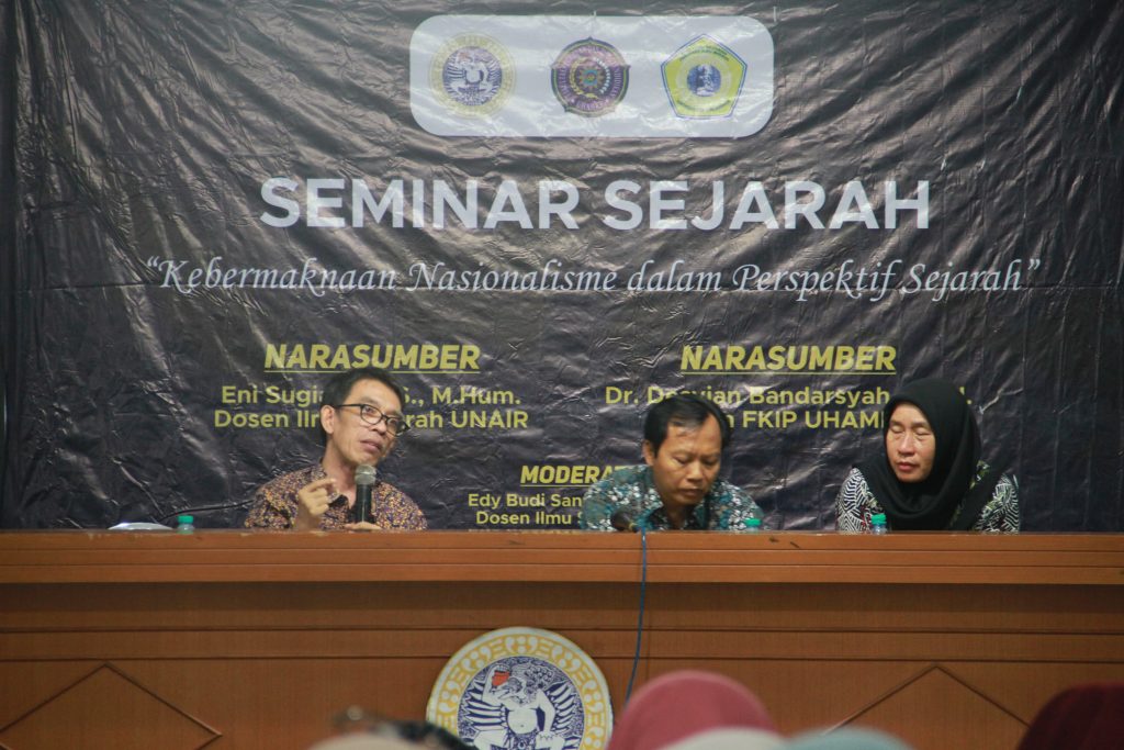 UNAIR NEWS – Menggali tema nasionalisme, Departemen Ilmu Sejarah Fakultas Ilmu Budaya (FIB) UNAIR bersama Program Studi Pendidikan Sejarah UHAMKA mengadakan seminar sejarah bertajuk “Kebermaknaan Nasionalisme Dalam Perspektif Sejarah” di Aula Siti Parwati, FIB UNAIR, Senin (18/02).