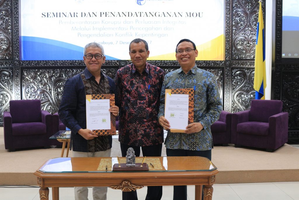 UNAIR NEWS – Universitas Airlangga dan Transparency International (TI) Indonesia menandatangani memorandum of understanding (MoU) soal komitmen pencegahan dan pengedalian konflik kepentingan (PPKK) di lingkungan perguruan tinggi. Penandatanganan itu dilakukan di Aula Kahuripan Lantai 4 Kampus C pada Kamis (7/12) melalui Rektor UNAIR Prof. Dr. Mohammad Nasih, SE., Mt., Ak., CMA., dan Sekretaris Jenderal TI Indonesia Dadang Trisasongko.