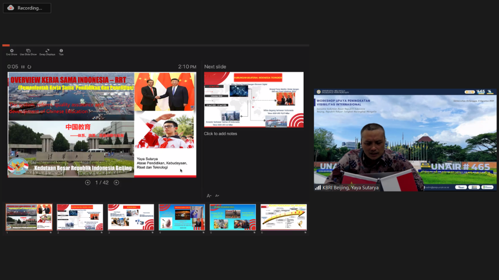 The workshop was attended by Yaya Sutarya, a representative of the Indonesian Embassy in China and Mongolia. Thirty-six UNAIR Faculty Ambassadors attended the online workshop on Wednesday, August 4, 2021.
