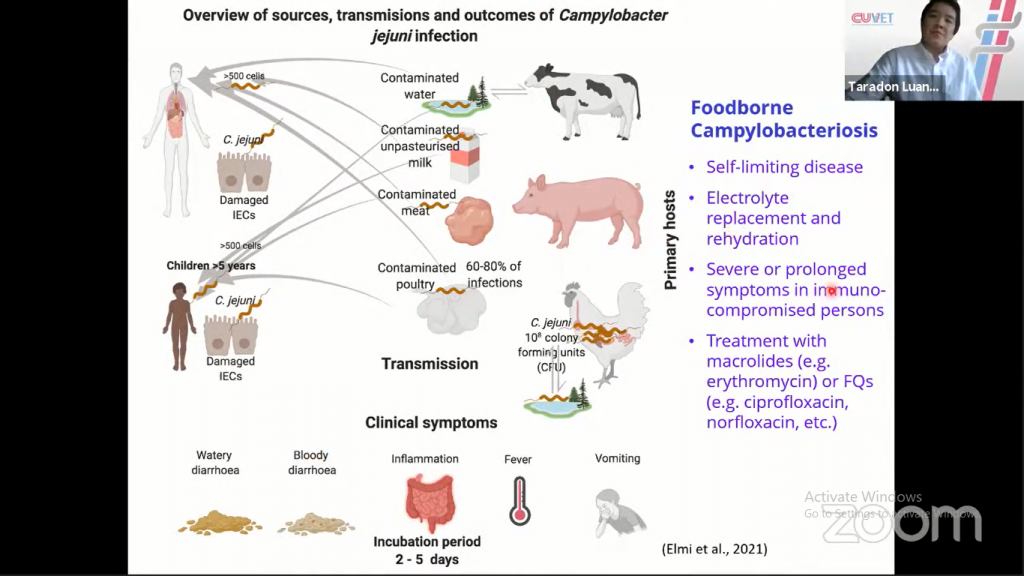 At the beginning of the presentation, Doctor Taradon said that Campylobacteriosis is a zoonotic disease caused by bacteria that can cause gastroenteritis in humans. Campylobacter species generally live in the digestive tract of warm-blooded animals such as poultry, cattle, pigs, sheep and ostriches, and domesticated animals including cats and dogs. This bacteria can also be found in shells.