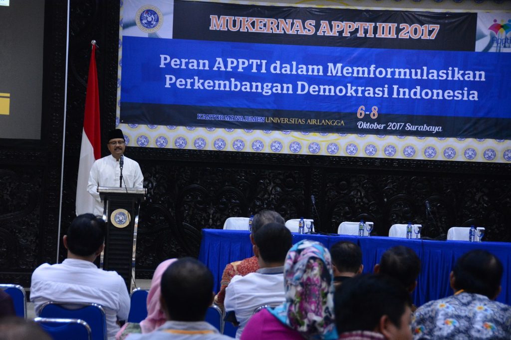 UNAIR NEWS – Universitas Airlangga menjadi tuan rumah Musyawarah Kerja Nasional Asosiasi Penerbit Perguruan Tinggi Indonesia (APPTI) III yang sebelumnya berlangsung di Universitas Sanata Dharma, Yogyakarta. Pada Mukernas APPTI III ini, “Peran APPTI dalam memformulasikan perkembangan demokrasi” diangkat menjadi tema kegiatan. Acara ini bertujuan untuk mensinergikan lembaga penerbit perguruan tinggi se Indonesia dalam memajukan kiprahnya.