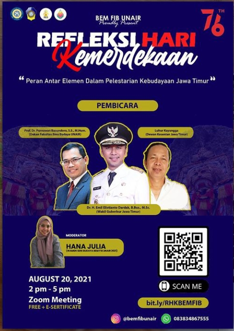 UNAIR NEWS – Wakil Gubernur Jawa Timur, Dr. H. Emil Elestianto Dardak, B.Bus., M.Sc. menjadi salah satu pembicara dalam webinar yang digagas oleh BEM Fakultas Ilmu Budaya (FIB) Universitas Airlangga (UNAIR). Webinar bertajuk “Peran Antar Elemen Dalam Pelestarian Kebudayaan di Jawa Timur” tersebut merupakan salah satu rangkaian dalam menyambut hari kemerdekaan Republik Indonesia yang ke-76.