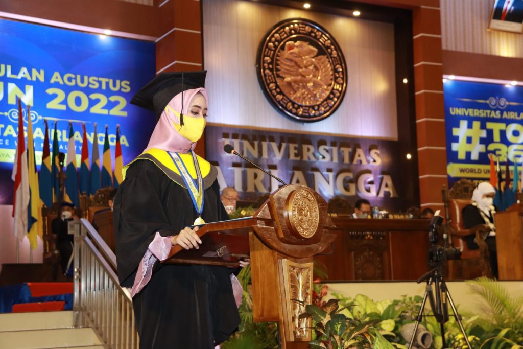 Hal itu tersirat disampaikan oleh perwakilan wisudawan, Adhinda Wibi Kinanti Putri, pada wisuda periode Agustus 2022. Kegiatan yang dihadiri Rektor Universitas Airlangga (UNAIR), Dekan Fakultas, orang tua, serta tamu undangan diselenggarakan di Gedung Airlangga Convention Centre (ACC) pada Sabtu (13/8).